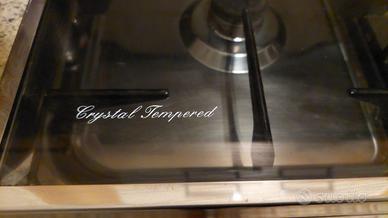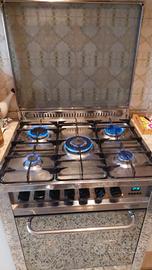 Cucina Lofra in acciaio, 5 fornelli, forno elettrico con girarrosto e varie opzioni di cottura. 90x70x60. Coperchio in cristallo temperato che quando chiuso preserva i fornelli e può diventare spazioso piano di appoggio