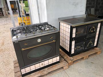 Cucina a gas in piastrelle di ceramica abbinata a spolert termocucina a legna con le stesse piastrelle in ceramica.