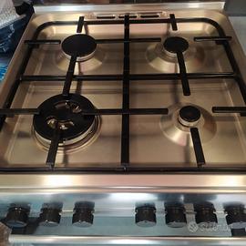 Cucina a gas Hotpoint Ariston, pari al nuovo, con quattro fuochi, di cui uno doppio, con forno elettrico e ventilato , con coperchio in vetro temperato, lo sportello inferiore ha ancora il film protettivo, in foto blu. È perfetta, con piatto da 60 cm x 60, tutta in acciaio, come in foto. Disponibile a Novara.
