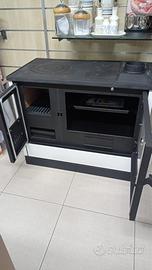 Struttura interamente in acciaio smaltato, camera di combustione in ghisa, piastra superiore in ghisa, vetro ceramico vista fuoco, diametro scarico fumi mm. 120/150.