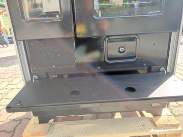 Cucina a legna tradizionale ROYAL BETTY 3,5 in acciaio smaltato nero con finiture in inox. Oltre a cucinare, scalda l'ambiente per irraggiamento. È composta da un piano cottura in acciaio e un forno smaltato nero con portina in vetro ceramico dotata di termometro. Nella parte bassa è stato situato un pratico cassettone portaoggetti. È predisposta per l'uscita dei fumi superiore, laterale e posteriore. - Ampio cassetto cenere estraibile per facilitare le operazioni di pulizia. - Un ampio piano cottura sfrutta il calore della combustione della legna per poter cucinare in modo pratico, ecologico ed economico. - Quando non viene sfruttato per la cottura, il piano si trasforma in una superficie radiante per scaldare l'ambiente. - Sun System: il riscaldamento dell'ambiente avviene prevalentemente per irraggiamento. - Possibilità di cottura al forno: Un pratico forno sfrutta il calore della combustione della legna per poter cucinare in modo pratico, ecologico ed economico.