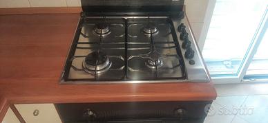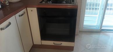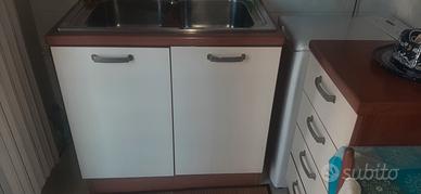 cucina componibile beige e legno completa di frigorifero, piano cottura,lavatrice con carica dall' alto e tavolo con due sedie