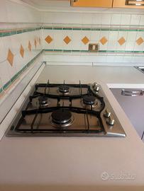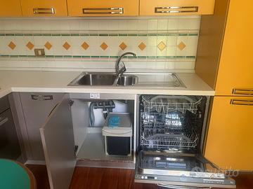 Cucina con penisola, legno massello, in ottimo stato, comprensiva di tutti gli elettrodomestici: frigorifero con freezer integrato, fornello con 4 fuochi con relativa cappa di aspirazione, lavastoviglie e forno.