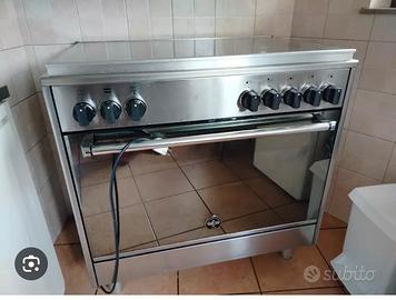Vendo cucina modello amn965exv bertazzoni la Germania americana . 🔧 Caratteristiche principali •Piano cottura: •5 fuochi a gas, inclusi: •1 bruciatore doppia corona (4,00 kW) •1 bruciatore rapido (3,00 kW) •2 bruciatori semi-rapidi (1,75 kW) •1 bruciatore ausiliario (1,00 kW) •Griglie in acciaio smaltato •Accensione elettronica •Manopole soft touch •Sicurezza sul piano •Design stampato in acciaio inox    •Forno elettrico multifunzione: •Capacità utile di 104 litri (volume lordo 147 litri) •11 funzioni di cottura •Doppia ventola per una distribuzione uniforme del calore •Grill elettrico •5 livelli di cottura •Vetro triplo e removibile •Tangenziale di raffreddamento •Contaminuti integrato •Piedi cromati