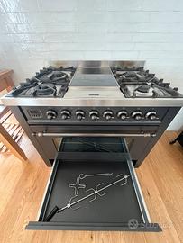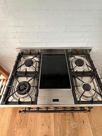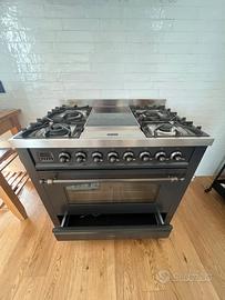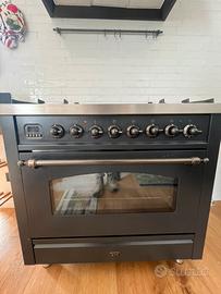 Vendo cucina ILVE 90 cm completa di cappa originale, configurazione rara gas + induzione con fry top centrale (tipo piastra professionale da ristorante). Caratteristiche: •6 fuochi totali: •4 fuochi a gas ad alte prestazioni •2 zone centrali a induzione •Piastra fry top (perfetta per carne, panini, pesce, tipo piastra da ristorante) •Forno elettrico ventilato di grande capacità •Struttura robusta con griglie in ghisa •Finitura nera opaca elegante •Manopole professionali Inclusa anche: •Cappa aspirante ILVE coordinata (valore importante)