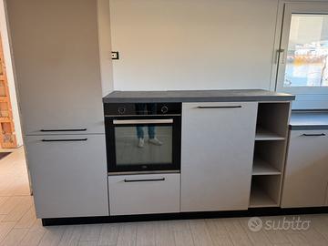 Cucina nuova MAI USATA completa di elettrodomestici nuovi mai collegati - colore grigio finitura cemento La cucina èra installata in un immobile nuovo ma non è mai stata usata: tutti gli elettrodomestici non sono mai stati collegati alla corrente. La cucina è modulare. La composizione originale era con forma a C di circa •lato principale 5,20 m •lato destro 2,45 m (con pensili) •lato sinistro 3,20 m Tuttavia puó essere rimodulta a piacere in base alle dimensioni. Elettrodomestici inclusi marca Beko: •frigorifero •lavastoviglie •forno •piano cottura a induzione •aspiratore •lavello doppia vasca con miscelatore Tutti nuovi e mai utilizzati. Caratteristiche •cucina Gentili •produzione 2024 •mai utilizzata •elettrodomestici mai accesi •pensili a tutta altezza fino al soffitto •ante beige opaco finitira cemento •struttura interna nera •numerosi pensili e cassetti capienti Nota bene: La cucina viene venduta senza piano di lavoro (top).