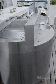 Cucina outdoor professionale in acciaio inox, dal design moderno ed elegante, pensata per contesti di alto livello. Soluzione completa che unisce funzionalità e impatto estetico, ideale per: ville di pregio beach club hotel terrazze vista mare Configurazione completa: BBQ/griglia a gas centrale 2 fuochi professionali lavello integrato con rubinetto professionale ampio piano di lavoro struttura interamente in acciaio inox satinato Caratteristiche distintive: design curvo raro e di grande impatto scenico di circa 190 cm qualità comparabile a cucine outdoor top di gamma ideale anche per uso professionale perfetta integrazione in ambienti moderni e marittimi Ottime condizioni generali sempre mantenuta con attenzione Disponibile per visione, ritiro a mano Prezzo Trattabile