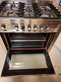 Cucina professionale datata ma in buone condizioni con 5 fuochi a gpl. forno da 90 ventilato 4 piani 6kw con possibilita di usare 3 kw usato pochissimo perche dove si usava non c'era corrente a sufficenza.