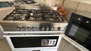 CUCINA GLEMGAS DISPONIBILE ORA Caratteristiche generali Classe A+ Griglie in ghisa Piano cottura di facile pulizia Accensione sottomanopola Caratteristiche in evidenza Chiusura porta comfort Vetro interno full glass estraibile Smalto interno forno Titanium Piedoni maxi Ø 60 mm regolabili in altezza Sicurezza Safe touch - Raffreddamento tangenziale Piano cottura 5 fuochi gas (1 bruciatore HP•C centrale 4,0 kW) Forno Forno multifunzione elettrico termoventilato Grill elettrico 12 tipologie di cottura Resistenza circolare Cavità sigillata ad alta efficienza Capacità forno 104 Lt Guide laterali cromate Timer contaminuti (60') 1 griglia forno 1 Griglia barbecue 1 leccarda