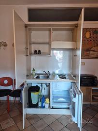 Cucina a scomparsa, perfetta per chi ha poco spazio oppure ricerca soluzioni per appartamenti destinati ad affitti brevi. Composta da piano cottura con due fuochi ad induzione, relativa cappa, frigo e due vani (uno superiore ed uno inferiore). In buone condizioni, con piccoli interventi può essere rimesso completamente a nuovo. Prezzo favorevole perché consegno solo su posto, no spedizione. Misure: profondità 60, altezza 215, larghezza 125