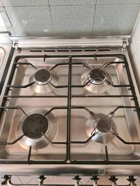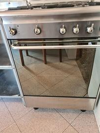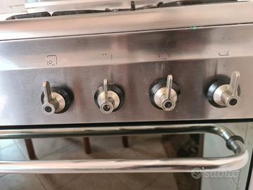 Marca: marchio Smeg (inciso sul bordo metallico sotto il coperchio in vetro e sulla fascia inferiore vicino ai piedi). Piano Cottura: 4 fuochi a gas con griglie smaltate nere. È presente un coperchio in vetro temperato paraspruzzi. Forno: elettrico . Comandi: Sei manopole frontali. Le 4 centrali controllano i fuochi del piano. La manopola a sinistra (con i numeri 50-250) controlla la temperatura del forno. La manopola all'estrema destra è solitamente dedicata al contaminuti o alla selezione delle funzioni del forno. Dimensioni: Sembra un modello standard da 60x60 cm.