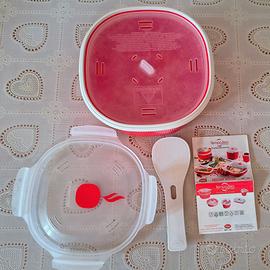 Cuociriso e cereali in microonde. Marca: Snips. Vassoio raccolta amido, spatola e libretto inclusi. Coperchio con fori per il vapore. Smontabile e lavabile in lavastoviglie. Made in Italy.