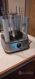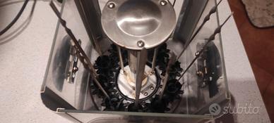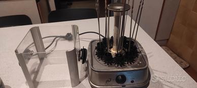 elettrico, due movimenti di rotazione, generale e singolo spiedino, 10 spiedini, carne e pesce, timer. evita che il grasso coli sulla resistenza bruciando e generando sostanze tossiche. cottura uniforme e perfetta. vetro di protezione totale anti schizzo, temperato. facile da pulire tutti gli ingranaggi amovibili