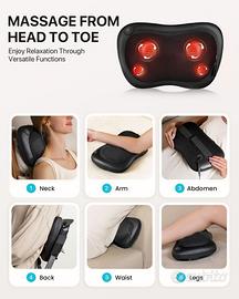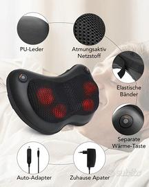 Vendo causa inutilizzo, perfettamente funzionante, cuscino massaggiante shiatsu utile per schiena e collo. Si può utilizzare in auto, in ufficio a casa. ALCUNE CARATTERISTICHE: •Impastamento bidirezionale dei tessuti profondi - 4 testine massaggianti Shiatsu che impastano profondamente cambiano automaticamente direzione ogni minuto. Questo massaggiatore ti dà una sensazione di relax come dopo un massaggio naturale alle mani per sciogliere e rilassare la tensione muscolare. •Piacevole funzione calore - La funzione calore con controllo indipendente (fino a 45 ℃) offre più comfort per i muscoli tesi e favorisce la circolazione sanguigna senza danneggiare la pelle. La funzione di spegnimento automatico di 20 minuti e la protezione contro il surriscaldamento integrata garantiscono una maggiore sicurezza. •Design ergonomico W - Grazie al design ergonomico a W, questo massaggiatore shiatsu si adatta perfettamente al collo e al corpo. Il cuscino massaggiante può essere facilmente adattato a diverse parti del corpo, adatto per massaggi su spalla, parte inferiore e superiore della schiena, polpaccio, piede e coscia. •Leggero e portatile - Con l'adattatore di alimentazione e l'adattatore per auto, puoi goderti il massaggio dei tessuti profondi a casa, in macchina, in ufficio o ovunque tu sia. Dimensioni portatili: 12.8 di larghezza * 20 cm di altezza •Cintura regolabile - Se stai cercando un massaggiatore comodo su cui appoggiarti durante il massaggio, questo cuscino per il massaggio del collo è un'ottima scelta. La cintura sul retro è facile da usare e regolabile in modo da poter agganciare il massaggiatore alla maggior parte delle sedie e delle auto. Se interessati, contattemi via email, vi risponderò nel giro di poche ore. Scambio a mano in zona