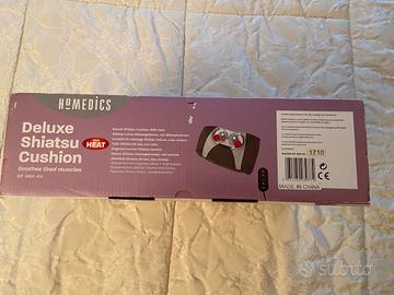 Vendo cuscino massaggiante termico HoMedics Deluxe Shiatsu, completo di scatola. Ideale per un massaggio rilassante e mirato su collo, spalle, schiena, gambe e zona lombare. Caratteristiche principali: Meccanismo di massaggio Shiatsu con movimento circolare dei pollici Funzione riscaldante (HEAT) per sciogliere tensioni e contratture Copertura rimovibile e lavabile per una facile pulizia Design compatto, elegante e facilmente trasportabile Perfetto per alleviare la tensione muscolare dopo una lunga giornata o un allenamento intenso. Condizioni pari al nuovo, usato pochissimo. Ritiro a carico dell'acquirente.