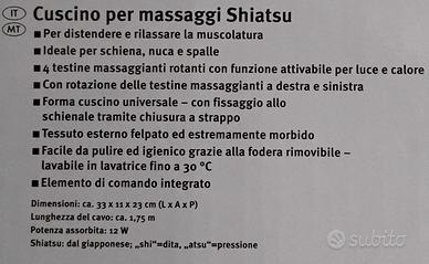 Cuscino massaggiante SilverCrest Per distendere e rilassare la muscolatura del collo, delle spalle o della schiena. Con 4 testine massaggianti e rotanti. Si può utilizzare anche in macchina poiché dotato di adattatore (vedi foto) Usato ma perfettamente funzionante, vendo per inutilizzo. Zona cinecittà/tuscolana Non spedisco Massaggi, shiatsu, relax