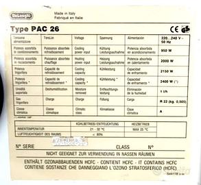 Pinguino De Longhi Super, Pac 26. Discrete condizioni estetiche generali, alcuni segni uso e del tempo come da dettaglio foto, testato e funzionante . Con tubo scarico aria retro come foto. Tensione alimentazione: 220/240 V - 50 Hz Potenza assorbita in condizionamento: 950 W Potenza assorbita in riscaldamento: 2000 W Potenza frigorifera: 2150 W Umidità asportata: 1 l/h Classe climatica: A