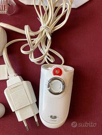 Braun Depilatore e rasoio elettrico , tre testine : gambe, inguine e rasoio . Accessori: Testina di depilazione, Testina zone sensibili, Testina rasoio , 5 Cappucci di protezione o regolatore per le diverse esigenze e zone. Batteria a lunga durata con ricarica rapida, ! Spazzola di pulizia . Custodia morbida e sacchetto . Nelle foto si può vedere che è tenuto molto bene, ma è stato usato pochissimo perché poco dopo averlo ricevuto ho fatto un trattamento laser.