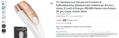 Vendo Deplite 21J epilatore a luce pulsata con funzione di raffreddamento integrata, adatto sia per donna che per uomo. Potenza fino a 21J con 9 livelli, tecnologia IPL per ridurre progressivamente i peli su corpo, ascelle e zona bikini, per una pelle più liscia e morbida nel tempo.