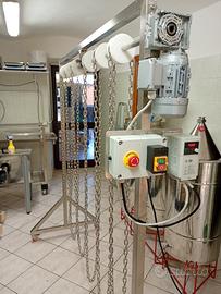 Vendo deumidificatore professionale per miele a catene, può deumidificare in contemporanea 2 fusti o 2 maturatori con 3 catene per fusto (6 totali), più in aggiunta altre catene per maturatori più piccoli. Costruito interamente in acciaio inox AISI 304 e catene in acciaio inox AISI 316. Pulegge fresate con CNC in DELRIN alimentare. Motore professionale trifase con inverter con alimentazione a 220 V, interruttore di Emergenza e fusibile di protezione. È possibile regolare la velocità di rotazione delle catene tramite l'inverter.