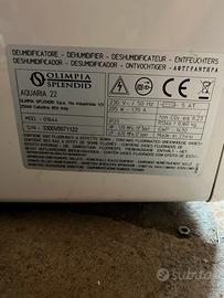 Deumidificatore olimpia. Usato pochissimo. Perfettamente funzionante. Ho messo la foto della etichetta per le caretteristoche tecniche .