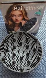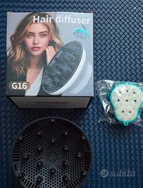 Diffusore per capelli ricci e mossi mai usato, completo di spazzola. Si adatta a quasi tutti gli asciugacapelli con ugello da 3,5 a 8 cm. Diametro esterno del diffusore: 16 cm.
