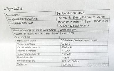 Come nuovo. Dispositivo di ottima qualità con la potenza dei laser LED da 808nm che arriva a 150mW mentre la maggior parte dei dispositivi casalinghe raggiunge al massimo 90mW. Questa potenza consente ai raggi infrarossi di arrivare ad una maggiore profondità e di essere più efficace. Ho aggiunto manuale di istruzioni stampato che normalmente non è fornito ma che va scaricato da Internet. Specifiche del prodotto: Capacità della batteria al litio integrata: 2600 mAh Lunghezza d'onda del laser: 808 nm e 650 nm Uscita laser terminale: raggi laser 2×808nm a 150 mW per LED e raggi laser 12×650nm a 50 mW per LED Materiale della cassa: ABS Materiale della lente: vetro temperato Impostazione timer: avvio da 5 minuti, 5-30 minuti regolabile in 6 step. Ogni step aumenta 5 minuti Potenza totale: 550 mW Descrizione: • Dispositivo di terapia laser a freddo: 2 x 808nm + 12 x 650nm. La luce rossa a 650nm funziona sulla superficie del corpo, riduce l'infiammazione e migliora i problemi della pelle. La luce infrarossa a 808nm penetra in profondità nello strato di tessuto per alleviare i problemi profondi della pelle, l'osteoartrite, problemi tendinei e altri dolori muscolari, tendinei e articolari profondi. (Nota: 808nm è invisibile all'occhio umano, ma può essere visto dalla fotocamera del telefono cellulare) • La terapia laser ha dimostrato di essere efficace per il dolore e l'infiammazione, così come la guarigione delle ferite. Questo è un trattamento scientificamente provato che fornisce una soluzione sicura e priva di farmaci per alleviare il dolore e trattare la pelle senza interventi chirurgici invasivi o farmaci potenzialmente dannosi. Il dispositivo di fototerapia a infrarossi non ha effetti collaterali. • Eventualmente, per alcuni problemi, può essere combinata con altre terapie come quella ad ultrasuoni e da integratori alimentari. • Si consiglia di utilizzare 2-3 volte al giorno, uso continuo per 4-8 settimane, per 20 minuti ogni volta (in base alle patologie)