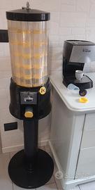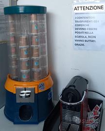 Distributore a moneta automatico meccanico che funziona con erogazione prodotto tramite barattolini (cilindri).