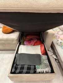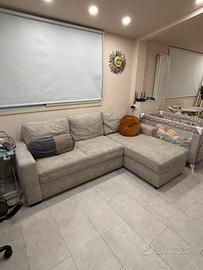 Divano 2 posti con penisola in tessuto moderno, colore grigio. Dotato di pratico contenitore sotto la penisola, ideale per riporre coperte e cuscini. Il divano è stato acquistato 3 anni fa ed è tenuto in ottime condizioni, senza segni di usura rilevanti. Linea moderna e versatile, perfetta per adattarsi a diversi ambienti della casa.
