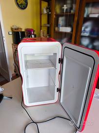 Minifrigo termoelettrico colore rosso, circa 14 litri, alimentazione 230v, isolamento: schiuma di poliuretano, materiali; scocca esterna ed interna in ABS antichoc, raffreddamento fino a 20°C in meno rispetto alla temperatura ambiente, altezza utile per alloggiare bottiglie da 2 litri, porta con chiusura magnetica, scaffalatura interna componibile, porta reversibile destra/sinistra.