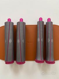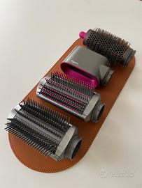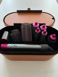 Dyson Airwrap Complete Long (modelloHS01) colorazione nichel/fucsia. Include tutti gli accessori originali: 1 unità base Dyson Airwrap 1 accessorio pre-styling (asciugacapelli) 2 coni arricciacapelli da 30 mm (per ricci voluminosi) 2 coni arricciacapelli da 40 mm (per onde morbide) 1 spazzola lisciante forte 1 spazzola lisciante delicata 1 spazzola volumizzante rotonda 1 tappetino antiscivolo resistente al calore + 1 spazzola pulizia filtro nuova mai usata e il cofanetto portaoggetti originale color cuoio (effetto pelle) Il dispositivo è in ottime condizioni, usato. Adatto a vari tipi di capello con lunghezza fino alle scapole o oltre le scapole, essendo questa la versione Long. Si garantisce l'originalità del prodotto, il numero di serie è chiaramente visibile nelle foto (etichetta nera sul cavo) Per domande non esitate a contattarmi