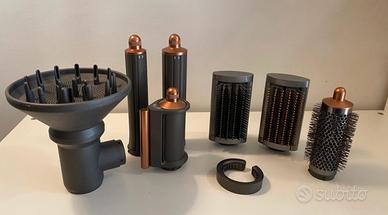 Dyson airwrap color rame. Completo di tutti i suoi accessori: due spazzole liscianti, due coni, spazzola rotonda e pre-styler lisciante, il tutto nel suo contenitore originale. Inoltre in regalo anche diffusore con adattatore (non originali).