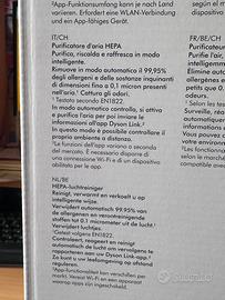ventilatore dyson che purifica l'aria con filtro Hepa all'85% con funzione di riscaldamento ideale per ambienti di medie dimensioni. Munito di telecomando magnetico e di connessione wireless per poterlo gestire anche da remoto