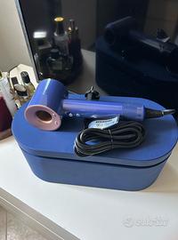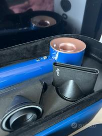 Asciugacapelli Dyson Supersonic in elegante color blu con dettagli oro. Include custodia e accessori. Design iconico e prestazioni elevate.