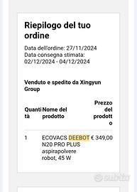 Vendo per inutilizzo robot aspirapolvere lavapavimenti Ecovacs Deebot N20 Pro Plus, acquistato recentemente e usato solo 5 volte. Il dispositivo è in condizioni estetiche e funzionali perfette, praticamente nuovo.