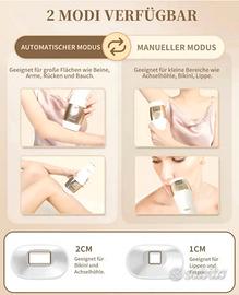 - Sono disponibili 2 modalità flash. Modalità automatica per le aree più estese (gambe, schiena, braccia) e modalità manuale per le aree sensibili o piccole (linea bikini, labbro superiore, ascelle).