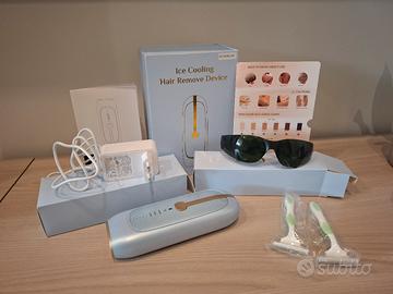 Epilatore luce pulsata con tre modalità: viso, corpo, bikini. Con funzione di raffreddamento a ghiaccio. Diversa intensita di emissione luce. Modalità luce automatica o manuale