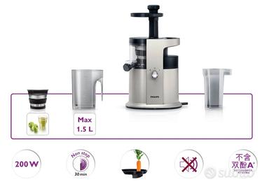 Vendo Estrattore Philips in ottime condizioni, perfettamente funzionante completo con i suoi accessori: 1 filtro maglie fini, 1 filtro maglie grosse, 2 brocche e lo spazzolino per pulire i filtri.