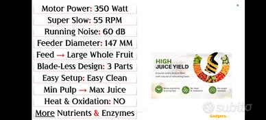 Estrattore di succo a freddo per frutta e verdura modello JE-37B di Canoly nuovo e mai utilizzato.