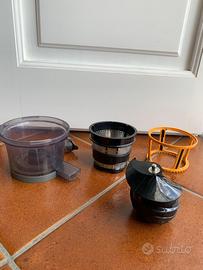 uno dei componenti interni presenta una spaccatura dovuta a una caduta (visibile in foto). Si tratta di un’ammaccatura che non compromette il funzionamento: la centrifuga lavora perfettamente e produce succhi senza problemi.