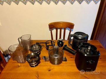 Funzionamento silenzioso, pulizia semplice, include set completo di accessori e filtri fine e grosso + ricettario e manuale di istruzioni.