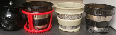 3 filtri : uno con fori piccoli consigliato per frutta con poca polpa (verdure e ortaggi duri, semi, frutta secca) oppure per ottenere un succo prettamente liquido. Un filtro con fori più grandi adatto per frutta morbida (fragole, banane, etc.) e per ottenere un succo con più polpa. Con questo filtro è possibile anche aggiungere alla frutta dei cubetti di ghiaccio per realizzare dei freschi frullati. Un filtro senza fori adatto alla realizzazione di creme dense o gelati alla frutta.