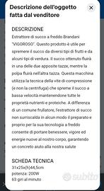 Vendo a 90€ , estrattore succo della Brandani. In foto trovate tutte le specifiche. L' elettrodomestico è nuovo, mai usato. No garanzia. Non effettuo spedizioni.