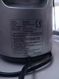 Estrattore Kuvings completo di tutti gli accessori originali. Due tipi di grata a buchi più stretti e più larghi, due contenitori di uscit: uno per il succo e uno per la polpa; spazzolino; strumento per spingere le frutta o verdura. Due sensi di rotazione per estrarre il succo al meglio.