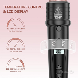 Controllo intelligente della temperatura: Il ferro arricciacapelli è dotato di un display LCD che mostra in tempo reale la temperatura di riscaldamento, regolabile da 80°C a 230°C. In questo modo è possibile adattare il calore in base al proprio tipo di capelli: 200–210°C per capelli spessi e difficili da domare, 180–190°C per capelli normali, 150–170°C per capelli fini. Inoltre, tenendo premuti contemporaneamente i tasti “+” e “-”, è possibile passare liberamente da °C a °F, per un utilizzo ancora più pratico