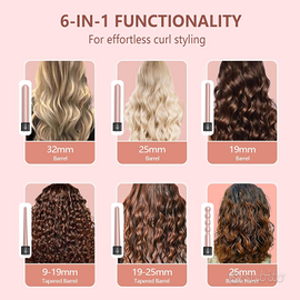Versatile set di ferri arricciacapelli 6 in 1: include 6 diverse misure di ferri arricciacapelli in ceramica (9–19 mm, 19 mm, 19–25 mm, 25 mm, 32 mm), adatti per creare una varietà di stili, dalle onde ai ricci stretti. Ottieni e soddisfa le esigenze di stile della vita quotidiana e delle occasioni speciali