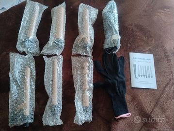 Set arricciacapelli in ceramica nuovo, mai usato, funzionante. La base ha ancora la pellicola protettiva, come si vede dalle foto. È possibile inserire 6 diverse tipologie di ferro per realizzare 6 diverse tipologie di boccolo. La confezione contiene guanto protettivo, base del ferro e 6 adattatori, tutti con sacchetto contenitore protettivo come da foto e libretto di istruzioni. Marchio Elehot.