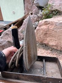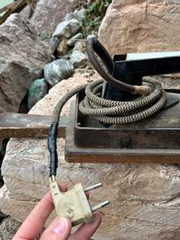 Vecchio ferro da stiro elettrico, probabilmente risalente agli anni ’40–’60, realizzato in metallo con manico in bachelite e cavo rivestito in tessuto intrecciato. Oggetto dal fascino vintage, ideale per collezionisti o come decorazione in ambienti dallo stile retrò o industriale. Condizioni buone per l’età, con segni del tempo che ne testimoniano l’autenticità.