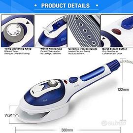 Materiale: ABS Lunghezza del cavo: 155 cm Capacità del serbatoio dell'acqua: 100 ml (suggerimento 80 ml) Tempo di cottura a vapore continuo: 15 minuti Cosa c'è nella scatola 1 x ferro da stiro a vapore 2 x accessori per il vapore 1 x misurino 1 x supporto per vaporiera