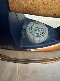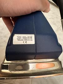 Ferro da stiro IMCO Mimosa, ideale come pezzo di ricambio. - Piastra in metallo lucido. - Manico in sughero e plastica blu. - Cavo di alimentazione rivestito in tessuto grigio.
